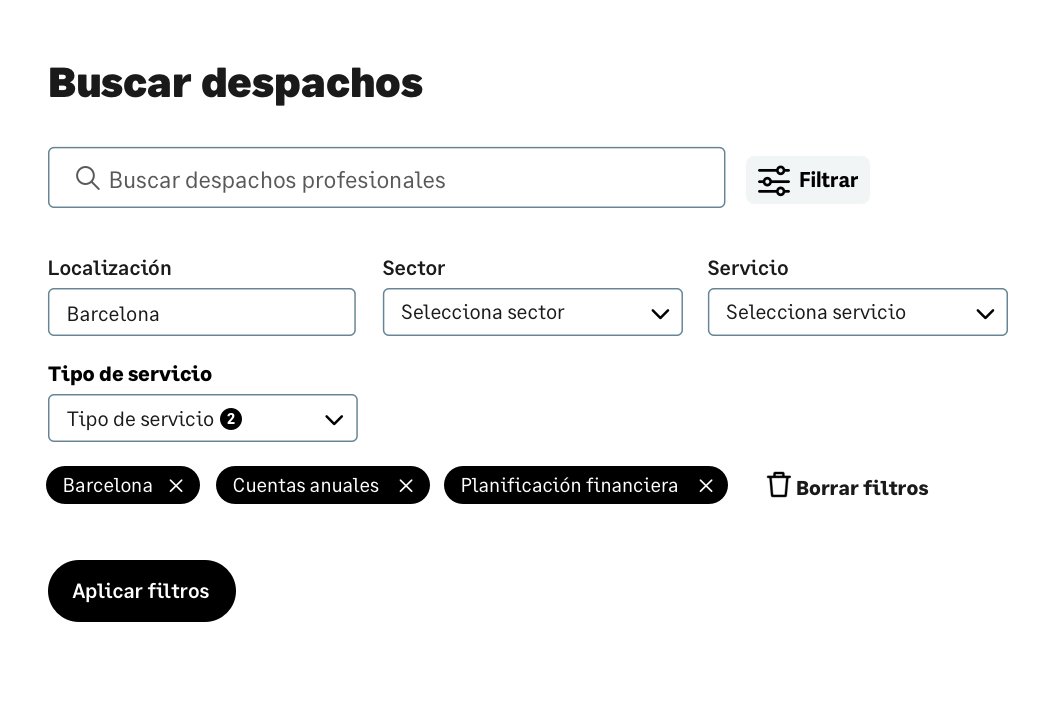 Entra en el mayor directorio online de despachos profesionales de España, ordénalos por ciudad, sector, servicios, o incluso valoraciones de usuarios, y encuentra rápidamente el despacho profesional que necesitas, sea cual sea la especialidad de tu negocio.
