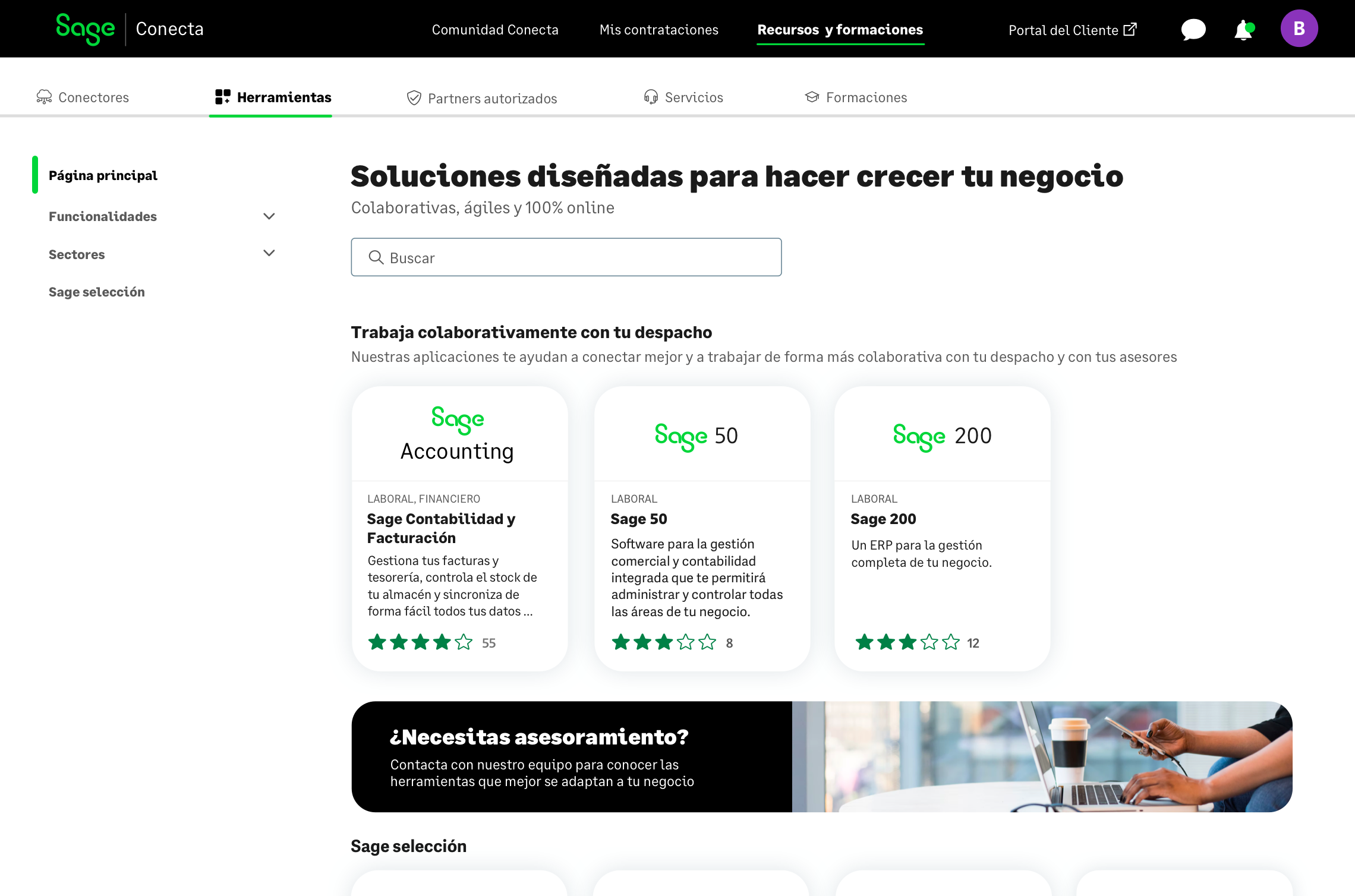 En Sage Conecta dispones de múltiples herramientas, colaborativas, ágiles y 100% online, que te ayudarán a gestionar tu negocio de forma más óptima, así como acceder a todas las subvenciones disponibles de tu sector profesional.